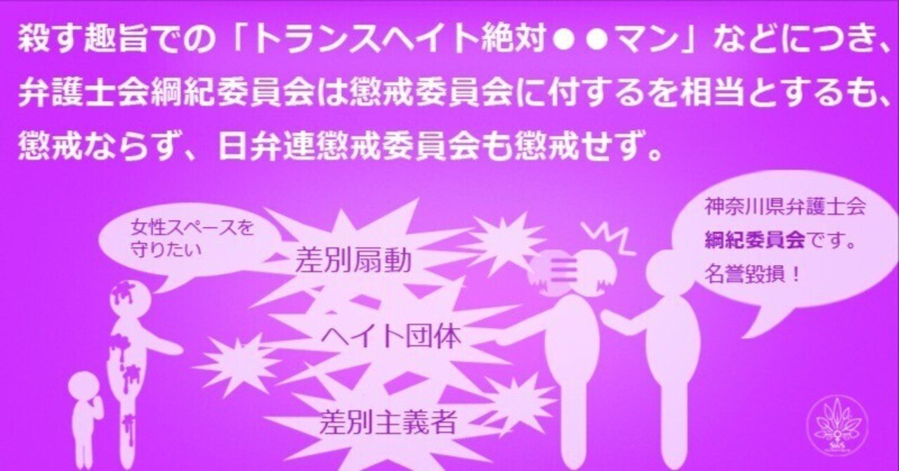 神原元弁護士を対象とした懲戒請求では、殺す趣旨での「トランスヘイト絶対●●マン」につき他に恐怖を与え弁護士職につき信頼を失わせたとする請求が認められたばかりでなく、追加請求事由とした当会のロゴを使って「女性スペースを守る会はヘイト団体です」としたことにつき、名誉毀損を構成するものであり「品位を失うべき非行」に該当する、としています。懲戒理由の要旨からすると「当会のロゴを使って」でなくても名誉毀損になると判断しています。どうぞ議決書などをしっくりと読んでくださいませ。