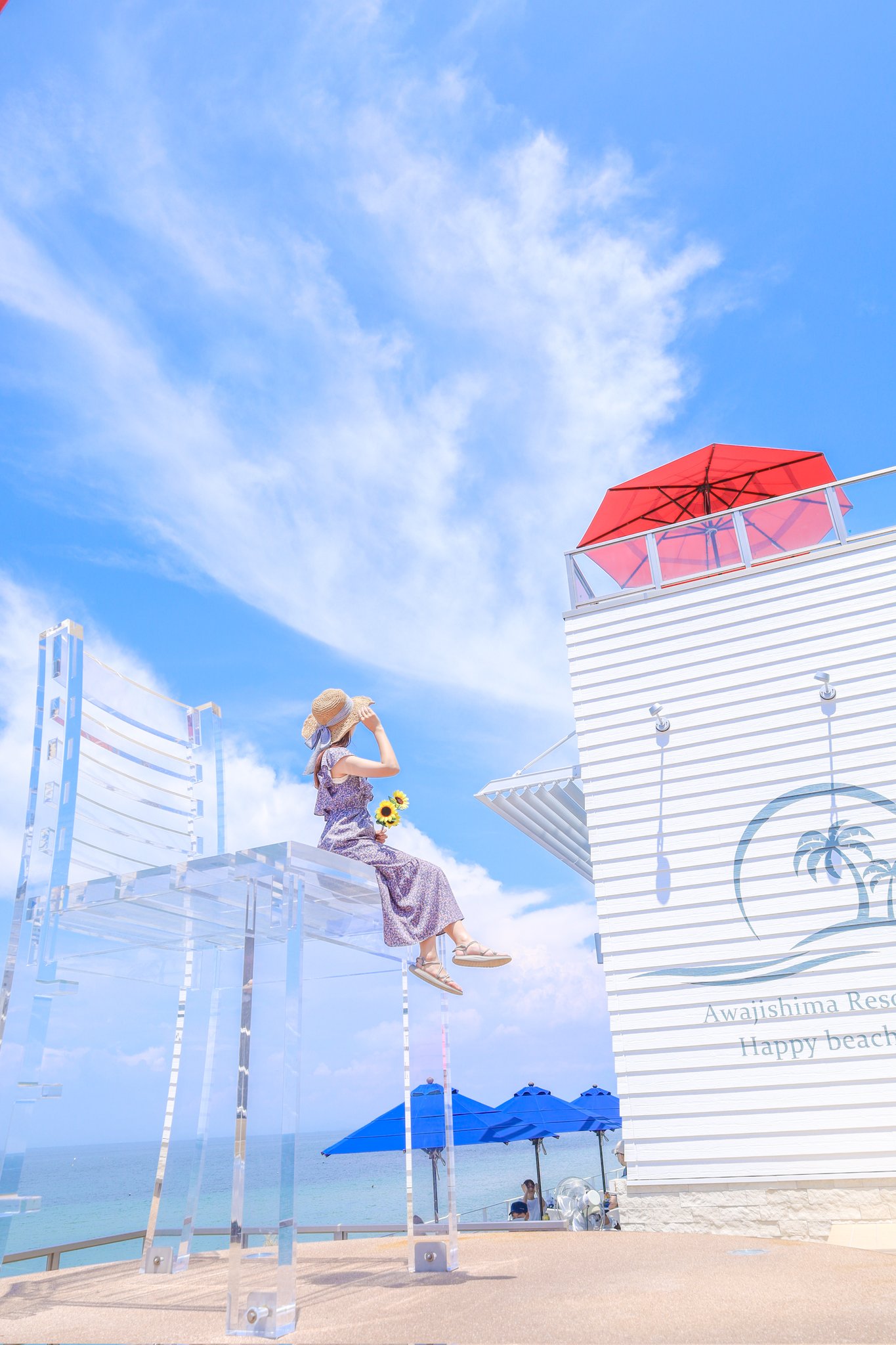 ロケーションが最高のお店らしい。海と空が透き通る巨大な椅子「幸せの椅子」の高さは約3m、透明な「幸せの椅子」に座って撮影した写真は、まるで海の上に座っているような不思議な光景になるらしい。